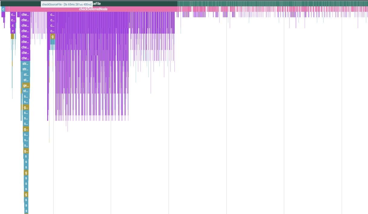 Despite all these past efforts (which certainly helped), we had to address the elephant in the room. The fundamental problem to solve for a great editor experience in TanStack Router was not necessarily related to the overall typescript check time. The problem we've been working to resolve is the bottleneck in the TypeScript language service when it comes to type-checking the accumulated route tree. For those familiar with tracing TypeScript, a trace for a large TanStack Router application could look something similar to the following: